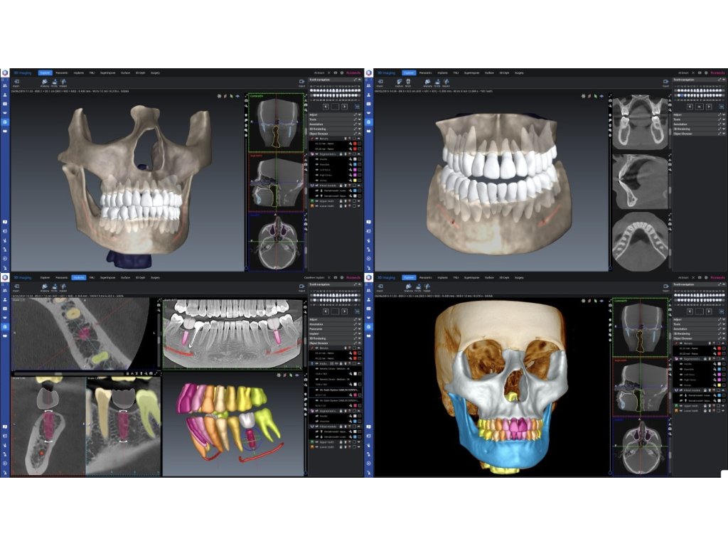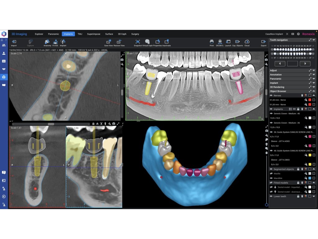 Modul pro 3D zobrazování v softwaru Romexis lze plynule rozšířit na komplexní software pro plánování ošetření, který podporuje plánování implantátů i ortognátní chirurgie. Kompletní implantologický pracovní postup navíc umožňuje navrhovat chirurgické šablony pro zavádění implantátů a dlahy pro ortognátní operace.