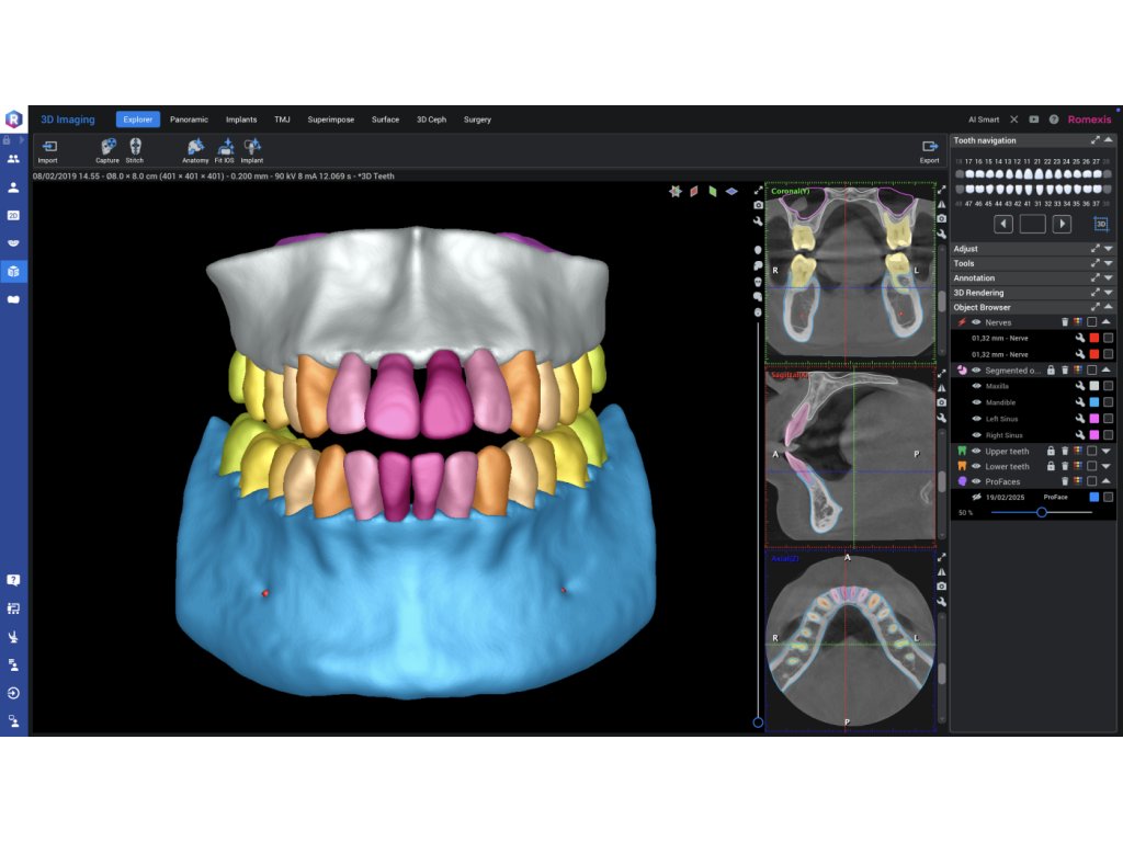 Výkonné diagnostické nástroje ve 3D - Univerzální diagnostické náhledy modulu Romexis 3D poskytují okamžitý přehled o anatomii pacienta – umožňují zobrazit snímky z různých projekcí nebo je automaticky převést na panoramatické snímky a řezy. Měřicí a značicí nástroje softwaru – jako je trasování nervového kanálu – dále podporují bezpečné a přesné plánování ošetření. Různé možnosti 3D zobrazení zlepšují vizualizaci a zároveň slouží jako skvělý nástroj pro edukaci pacientů.
